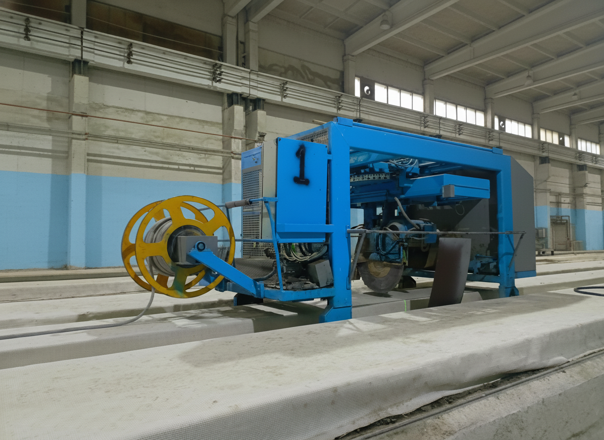 Самый зрелищный этап. Формующая машина (экструдер) движется по рельсам над дорожкой, оставляя за собой готовую бетонную ленту.